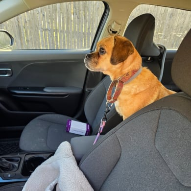 Phoebe is my 14 year young puggle. She is living her best life. She enjoys bones served to her on her sofa, a delicious home made bowl of kibble with all the healthy fixings and cool drink of water to wash it down. On warm summer days she can be found sunning herself in the yard and in the winter she snuggles in front of a roaring fire. She enjoys a good nap in her king size bed, a walk where she can sniff everything along the way, and is always up for a drive about town.