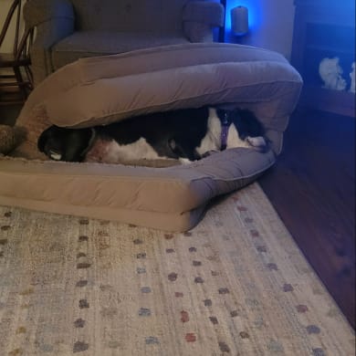 Doralee was rescued from a high kill shelter at 5 and spent 6 years in a shelter. I found her sweet face online and adopted her. She came from Florida and I live in Illinois. Ive had her 3 years now. She likes to fold her bed in half.