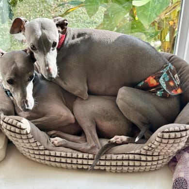 The sweetest bonded sibling brothers who spent most of their first five years indoors, in a crate. They were never socialized or potty trained. Slowly they are learning to love being in a home where they are truly cared for.