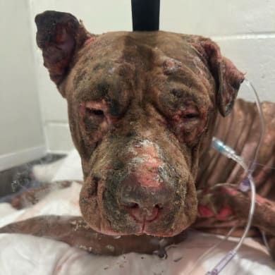 Constantine was with his owner when their car caught on fire. They both got out, but Constantine got spooked and jumped back into the burning car. His owner dropped him off at the pound a day or two after this happened. Constantine suffered that whole time without any type of pain meds. The rescue was called and took Constantine immediately and took him to the hospital to be treated for his severe burns. He has a long road ahead of him, but is recovering slowly.