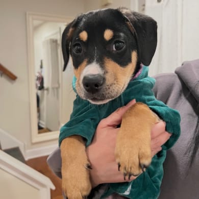 Hazel is a 3 month old 16lb shepherd/lab mixed breed up for adoption in Bucks county, PA.