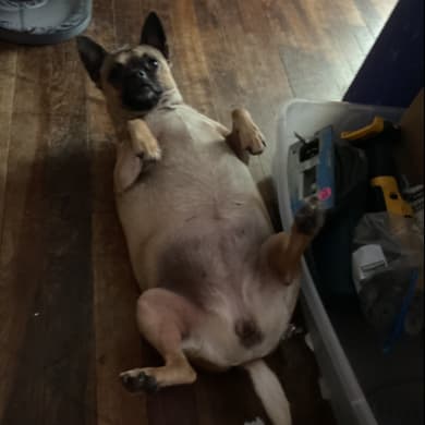Lola was one of two siblings taken in by a rescue. They were half French Bull dog and half Chihuahua. She was so tiny at 8 weeks that I feared she may be sick. When we took her back to our Vet at 6mths old they ran a hundred tests trying to figure out why she got so big! Tiny head huge body, our girl is quite the oddity but I love that little girl. She is a scratch for your attention kind of gal and my husband and I are always covered in her scratches.