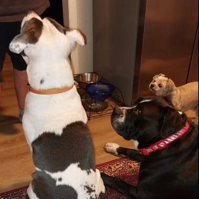 Obie (black), Davey (b/w) are both rescue pit mixes and are the sweetest. Chuie, (tan) my little man no longer with us doggy form but in spirit is a shitz/jack russell mix. He was the best boy. My little man