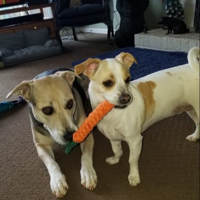 Clover and Bean both have horrible and tragic stories. So awful that I won't talk about that. Instead I'll tell you that Clover rescued us 4 years ago when she was 2 years old. Bean rescued us 2 years ago just a couple of months after he was born into an animal hoarding situation. We love them both SO MUCH and, like every other dog I've had, they're totally spoiled and I can't imagine life without them.