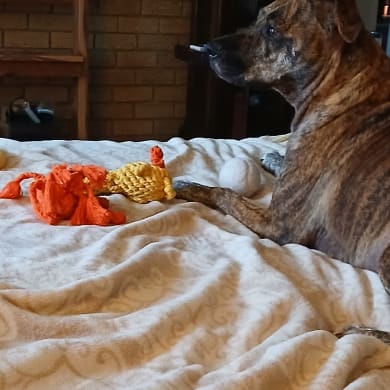A message came out from our local Animal Shelter, they needed help. The day before they were called into a hoarding rescue, where they rescued over 50 dogs who were all in horrible conditions. They needed animal supplies and asked for people to come in and foster because of overcrowding. We fostered Miss Georgia for a month then decided to adopt her into our family. She is 3 years old now. Loves our neighborhood walks. Snuggles at night and has been great with our kitties.