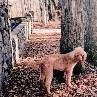 Riley is a standard poodle who comes from a breeder. He is well loved.