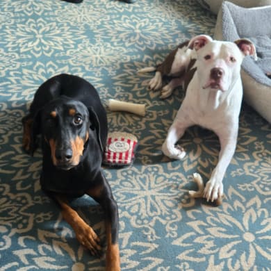 Anja was adopted at 5months of age from DARE, Doberman Awareness Rescue & Education in VA. She is a sweet and goofy 6yo. Niko was adopted from a shelter in VA 5 yrs ago. He is approx 10yo. He was a frail guy when adopted but now weighs 80lbs. He is a hug love bug that bullies his way for attention. Anja and Niko are great friends and adored by all who meet them.