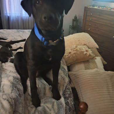I call him Carlos bandana when he wears his guitar bandana. His aunt made it for him when my dad died. He used to play guitar, so she made a bandana with pictures of guitars on it for him to wear in memory of her grandfather, my dad.\n That is why I call
