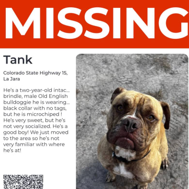 I recently joined because a very important family member is missing ! Our dog Tank went missing on October 28th from the Conoco in La Jara ! Disappeared into thin air! Tank slipped out of the car while we were fueling! Tank is a 3 year old intact male Old English Bulldoggie! He is chocolate brindle! He was wearing a black collar and is microchipef! He is loved very much ! I’m am brokenhearted 💔 with out him! I raised him from birth 🐾❤️🐾 I have contacted all of the shelters and local vets! We have ran a paw booster, left a scent basket and have ran multiple facebook posts in all groups I come across or someone recommends! We reached approx 4000 people on line and I haded out or posted aprox 200 lost dog fliers! We only had 3 possible sightings 🫤💔 still no Tank ! 💔I just moved to La Jara so he doesn’t know the area ! How does a dog disappear into thin air? How has No One seen him? I am offering $1,000 for his safe return home ! If you know his whereabouts,PLEASE DO THE RIGHT THING! No questions asked!! His family misses him terribly and we aren’t complete with out him! ❤️💔 970 596 8285