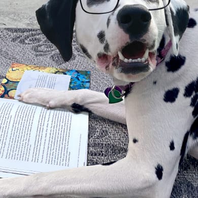 I was miraculously rescued by my human family after an agonizing time of hoping I would never have to be returned to my place of origin. They came back for me! Now I live an amazing life with my meditation partner (and fellow rescue), Priya and all my neighborhood friends! My favorite things are running, my squeak toys, floating on the water, snuggling.- oh, and reading, of course!