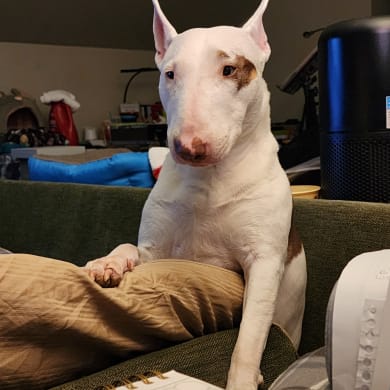 I'm Petunia, and I'm a five year old Bull Terrier living in the Ozarks, USA! I was adopted thru Bull Terrier Rescue Mission, a nationwide program that works to save Bull Terriers from shelters. I am obsessed with my Mom and yak chew bones! I love long hikes, especially if there's lots of rocks to climb! I enjoy brief swims if Mom is right by my side, and I love riding in boats or on a paddleboard! I sometimes burst into delighted spins and zooms because that's how the Bull Terrier do.