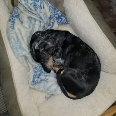 Oliver is a 14-year old dappled dachshund. He loves "protecting" his home and going for long rides