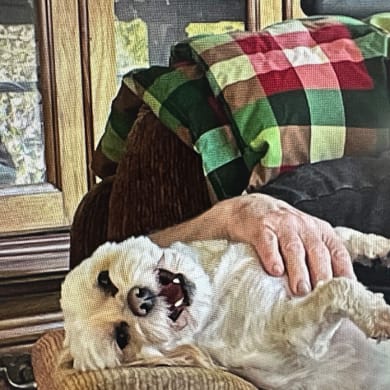 When I first started looking for a new puppy my son took me to an event at a grocery store put on by Ginger’s Pet Rescue. I walked up and down the aisle searching for my perfect puppy. My son handed me a puppy that was so cute but I continued to look at every cage when I saw him. He was sitting in the back corner of his cage looking at the wall behind him. I stopped and said “Hi there” he turned and looked into my eyes and my heart melted. I fell in love that very moment and said “He’s mine”. From that moment on he has been our boy and he will forever be my Reggie. He is so well mannered and cuddles like no other dog l have owned. He was two years old when I got him and now it’s eight years later. As you can see from his face he actually smiles. I will always love this guy!