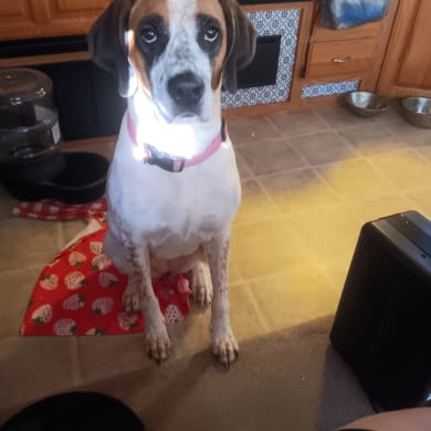Sheba is a rescued redtick hound, sweet, funny, loves to eat (she came to us emaciated, starved, and covered with ticks)...she's mama's girl...and turns anything and everything into a toy...while her sister (black mastiff) is the comforter, Sheba is the protector