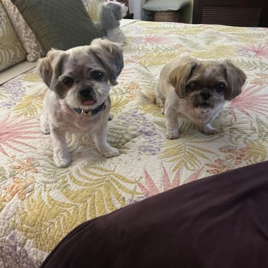 Both dogs are rescues. Leo is 9 and Leah is 14. Both were given up because of Health or behavioral issues. We have had a total of 6 Shih Tzu, over the years All have been rescues, that needed a little special care… Leo really watches over his big sister, as she has limited sight and hearing. They have been together three years now and you would think they’ve known each other forever!