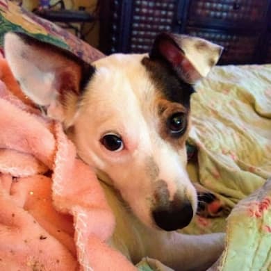 I saw this dog being kicked out onto a busy road, a car ran over him. I pulled over to help, when I opened my door he jumped into my lap! I search over a month for his owner unable to find one. He's been by my side ever since!