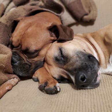 Sigr is a blackmouth cur, found as a stray in southern Tennessee, where he was roaming with another puppy. The rescue tells us he had 0 interest and was on the shortlist when we happened to find them on a pet finder search. They coordinated Sigr's 9 hour van ride after we completed the application and he spent a week recuperating from neutering. He had been called Brady, but now he lives his best life alternately chasing squirrels around the farm and snoozing on the couch before being tucked into bed every night here in Michigan with his older dog-sister and dog-brother. And his name is Sigr, which is Old Norse for 'victory'.