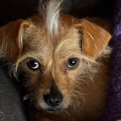 Mindie is 3 and we adopted her almost 2 years ago. She was terrified but with excessive amounts of love and burgers from drive through she has settled into lazy days in the recliner and walks with Daddy every night. She lets us kiss her head!!
