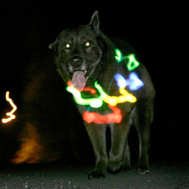 Dog was found wandering out of the woods after a violent thunderstorm. He was in bad shape. He walked up to a friends son and bonded, picked the right kid. With school and work commitments, they could only foster him for a while and only called him 'The Dog'. I took him in, agreed not to change his name and he was my best friend for 3 years until cancer took him. I loved him and he loved me, and loved his Christmas lights necklace too.